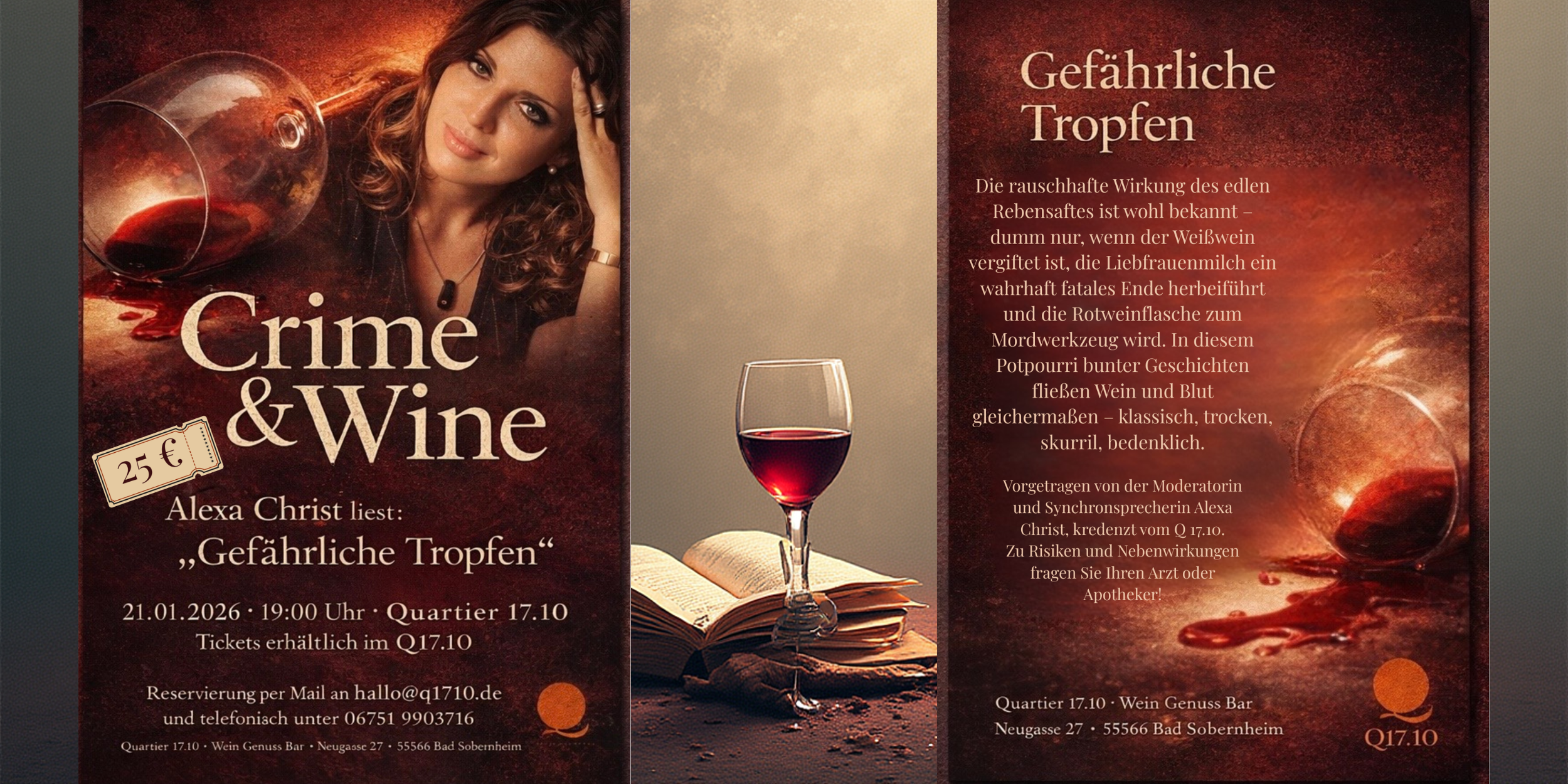 Die rauschhafte Wirkung des edlen Rebensaftes ist wohl bekannt – dumm nur, wenn der Weißwein vergiftet ist, die Liebfrauenmilch ein wahrhaft fatales Ende herbeiführt und die Rotweinflasche zum Mordwerkzeug wird. In diesem Potpourri bunter Geschichten fließen Wein und Blut gleichermaßen – klassisch, trocken, skurril, bedenklich. Vorgetragen von der Moderatorin und Synchronsprecherin Alexa Christ, kredenzt vom Q17.10. Zu Risiken und Nebenwirkungen fragen Sie Ihren Arzt oder Apotheker!