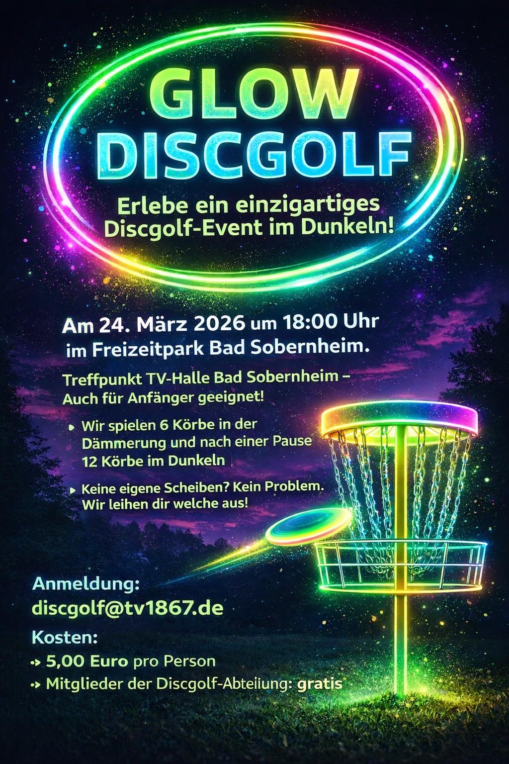 Leuchtende Scheiben, beleuchtete Körbe und ein einzigartiges Erlebnis erwarten Euch beim Glow-Disc-Golf-Event des TV Bad Sobernheim am 24. März 2026.