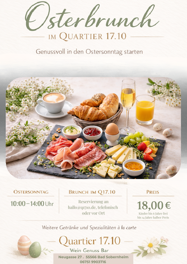 Das Quartier 17.10 lädt am 05. April 2026 von 10:00 bis 14:00 Uhr zu einem reichhaltigen Osterbrunch in gemütlicher Atmosphäre ein.