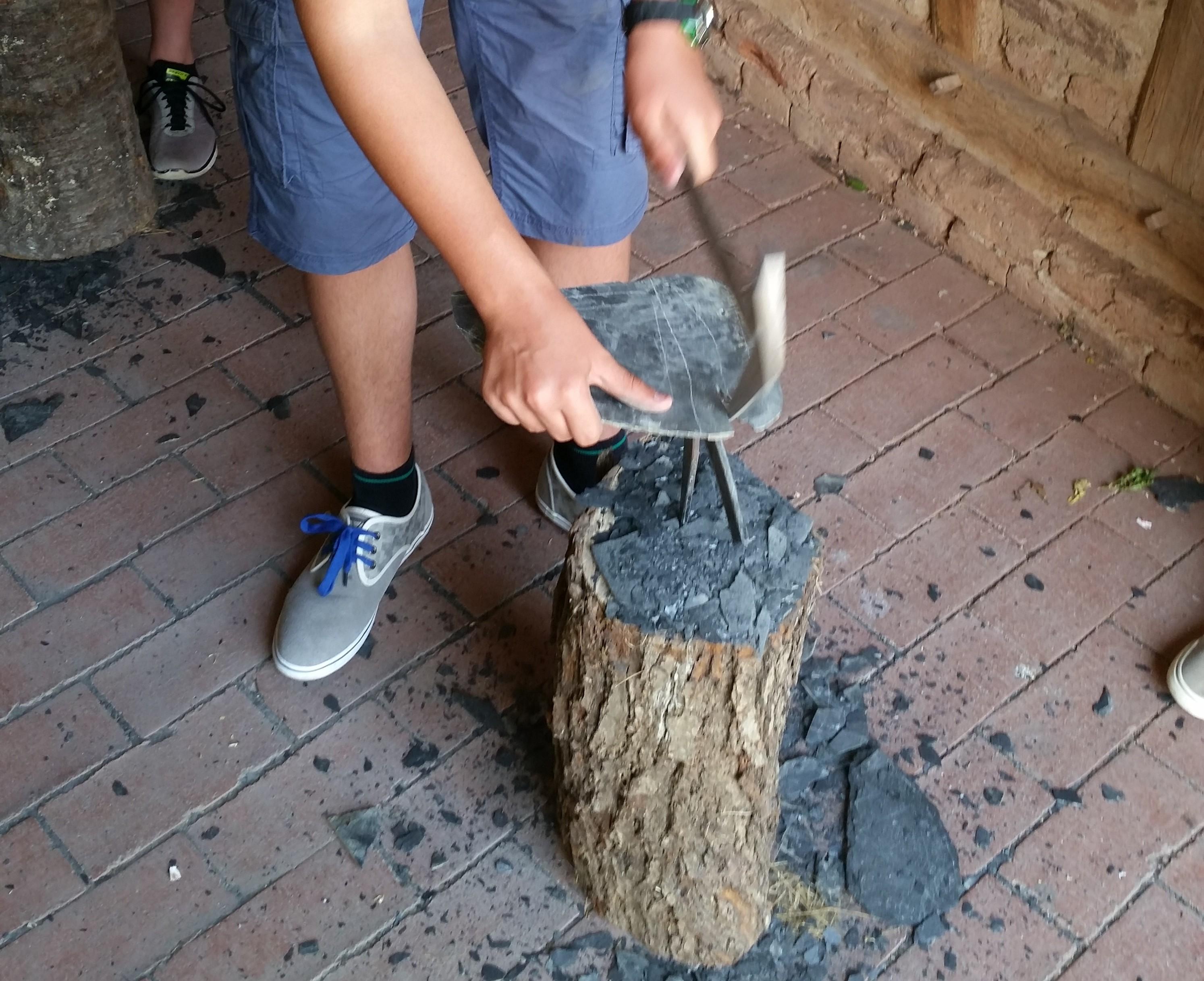 Mit Schieferhammer und Haubrücke werden Schieferstücke in Form gebracht. Anschließend werden für einen Aufsteller der Schieferplatte passende Holznägel mit dem Zugmesser an der Schnitzbank erstellt.