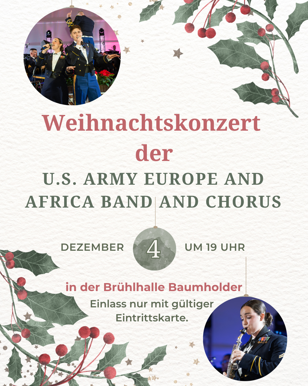 Stadt und Verbandsgemeinde Baumholder freuen sich auf ein festliches Konzert der U.S. Army Europe and Africa Band and Chorus, das am Donnerstag, 4. Dezember 2025, um 19:00 Uhr in der Brühlhalle Baumholder stattfinden wird.